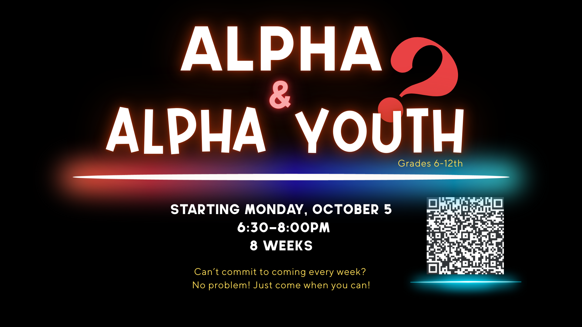 ALPHA Youth. While adults are gathered together to explore the basics of Christianity through Alpha, we’ll also be offering ALPHA Youth in The Gathering Place. This content and discussion is geared towards students in grades 6-12. Alpha Youth is a new way for young people to explore life, faith and purpose. Made for this generation, the new series creatively unpacks the real questions young people have. The series introduces and explores the core ideas of the Christian faith, in a relevant and engaging way.