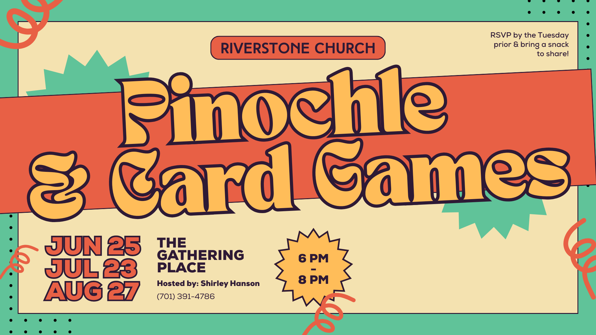 Back to All Events Pinochle & Card Games Thursday, July 23, 2026 6:00 PM 8:00 PM Riverstone Church 2700 State Street Bismarck, ND, 58503 United States (map) Google Calendar ICS Pinochle & Card Games Night will be held at 6:00 PM in The Gathering Place. Please bring a snack, appetizer, or dessert to share and RSVP to Shirley Hanson at (701) 391-4786 by the Tuesday prior if you plan to attend!