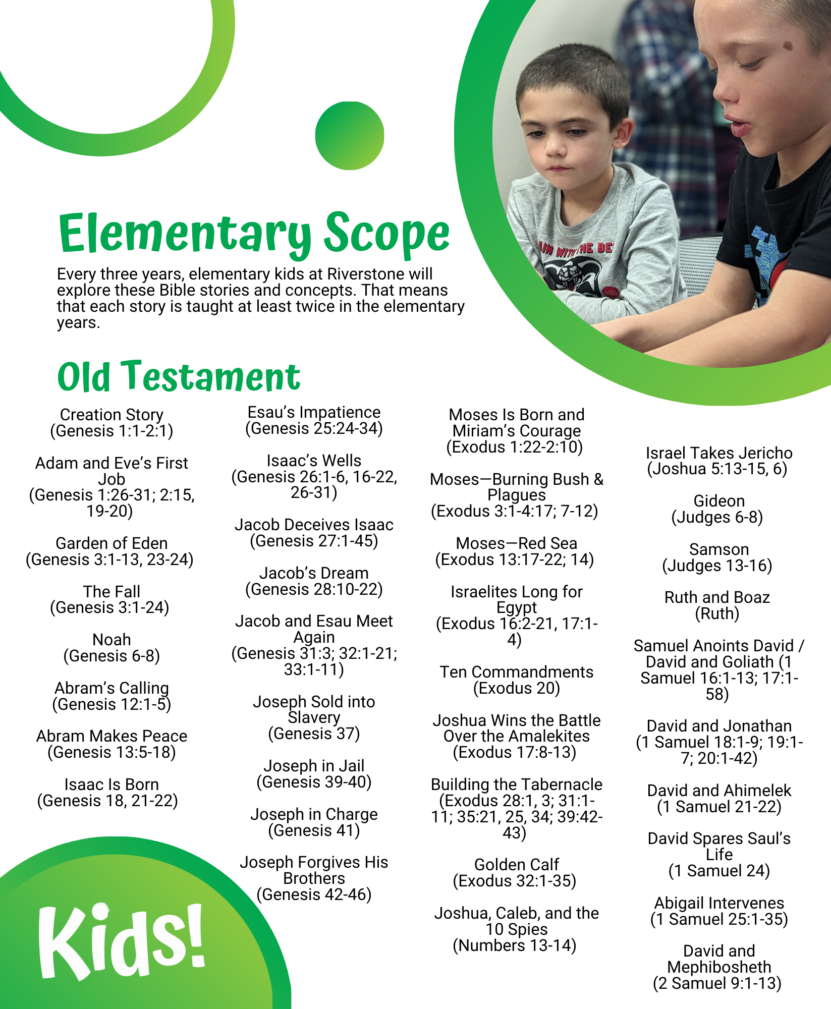 Elementary is our widest age group which covers children in kindergarten through fifth grade. Not only do we continue to cover all of the Bible stories we learned in preschool, we also start to build on Biblical knowledge through additional stories and scripture. Our “elementary scope” includes the specific content taught in the three year elementary cycle. That means that kids are getting the same stories twice in the elementary stage - which serves as great reinforcement! Elementary kids tend to be very hands-on so our lesson plans include a wide variety of crafts, STEM activities, and games.